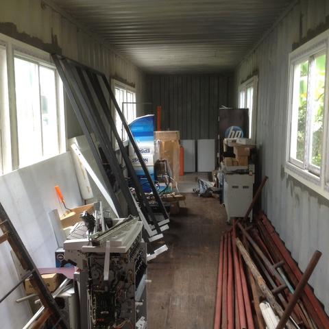 ตู้ที่ 1 สีส้ม+เขียว เคยใช้เป็นร้านถ่ายเอกสารบุภายในแล้ว มีหน้าต่างที่ฝาด้านเดียว 4 บาน มีประตู้กระจกบานเลือนขนาด 2×2 ม. มีไฟภายใน